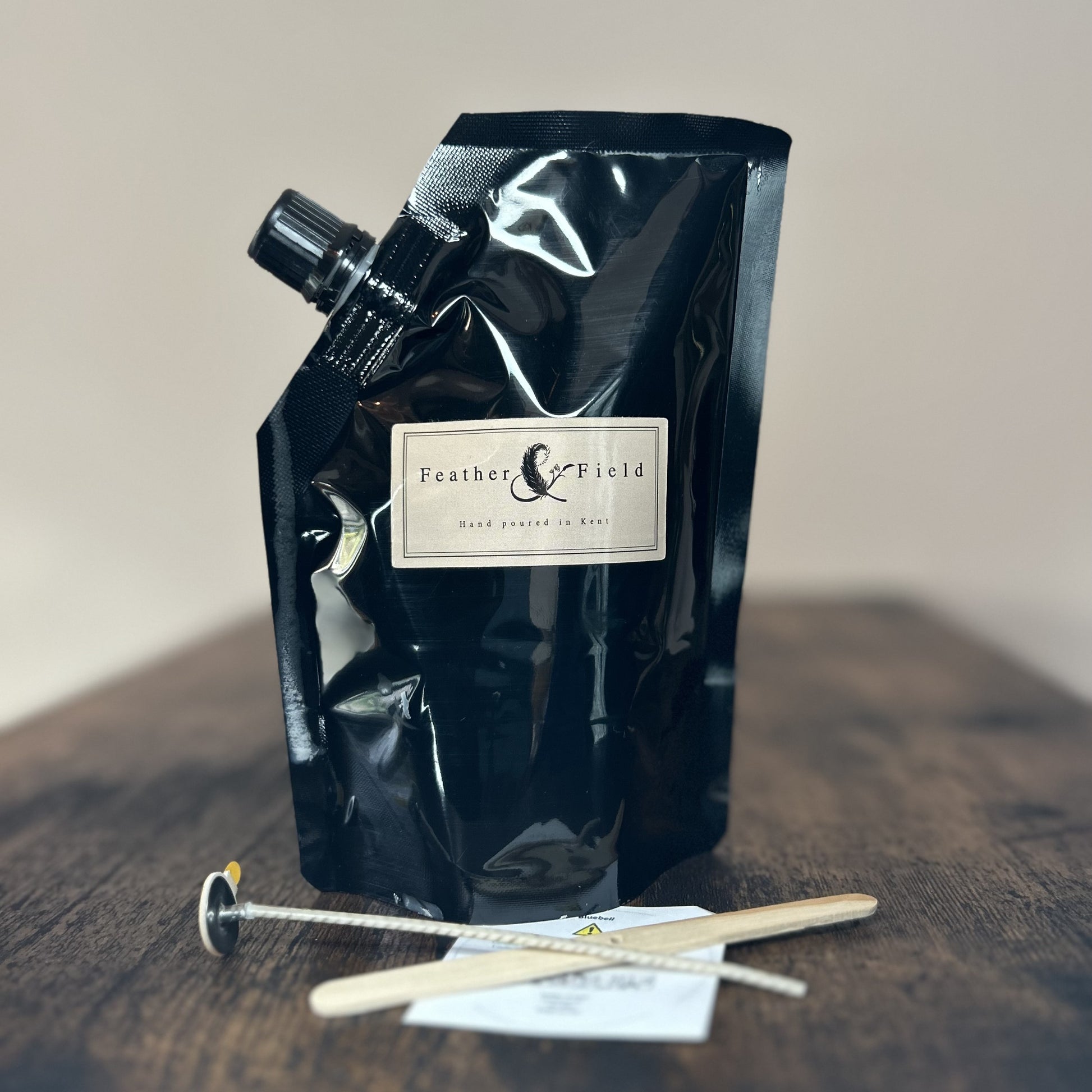We have created a candle in a pouch to make refilling your empty candle containers quick and simple. No need to send your containers back to us, instead have a little fun pouring your favourite scent at home. You will receive full instructions, a wick and wick centering tool to make this a fun and easy process.